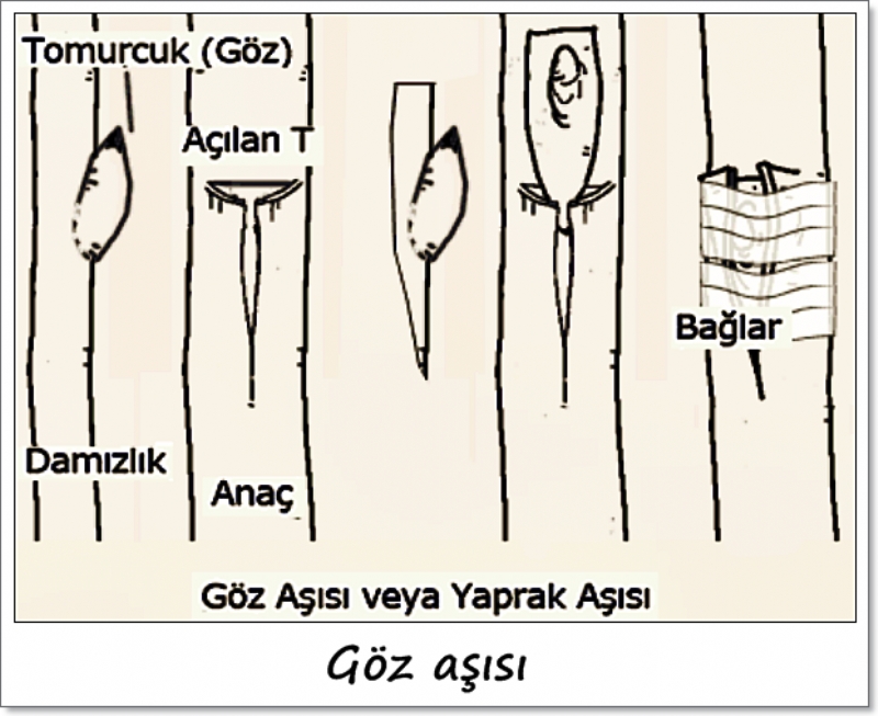 a) T göz aşısı: 6 mm ile 2.5 cm arasındaki çapa sahip anaçlara büyüme devresinde uygulanır. Aşı topraktan 5-25 cm yükseklikte yapılır. Anaç T şeklinde kesilir. Göz ise kalkan şeklinde odunlu ve odunsuz olarak kesilir ve anaçta açılan T içerisine yerleştirilir. Aşı yeri rafya ile hava almayacak şekilde bağlanır. Aşı bağı 15-20 gün sonra kesilir.