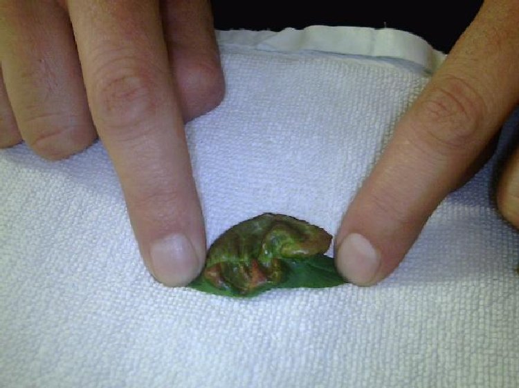 Geç dönemde yaprağın sadece bir bölümü hastalanır, kırmızımtırak rengindeki hastalıklı bölümler sert ve kırılgan olur. Hasta yapraklar normal yapraklardan daha kalındır. Genç sürgünler kalınlaşır, eğilir ve gelişmeleri çok yavaş olur. Dalın kalınlaşması hasta kısımlarda sarı veya koyu kırmızı renkte kabarıklar şeklinde olur.