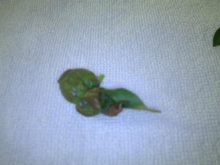Hastalık gözlerin patlaması sırasında oluşursa dal normal gelişmez, boğumlar arası kısalır ve dalın ucunda ağaç üzerinde büzülmüş ve kurumuş yaprak buketleri bulunur. Meyvede bozulmalar, meyvenin bir kısmında sarı veya kırmızı renkte gelişigüzel şişkinlikler şeklindedir. Zamanla bu kısımlar irileşir ve yaralar daha koyu renge dönüşür. Tümörlü bir görünüm alan meyvelerin zamanla çatladığı ve çekirdek evine kadar yarıldığı görülür.