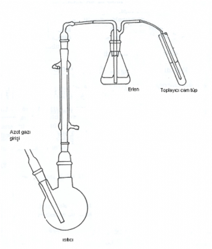 Şekil 01.deki gibi bağlantılar yapılarak saniyede bir kabarcık gelecek şeklide azot gazı bağlanır. Destilasyon balonuna 15 mL fosforik asit eklenir eklenmez geri soğutucuya bağlanır ve destilasyon işlemine başlanır.