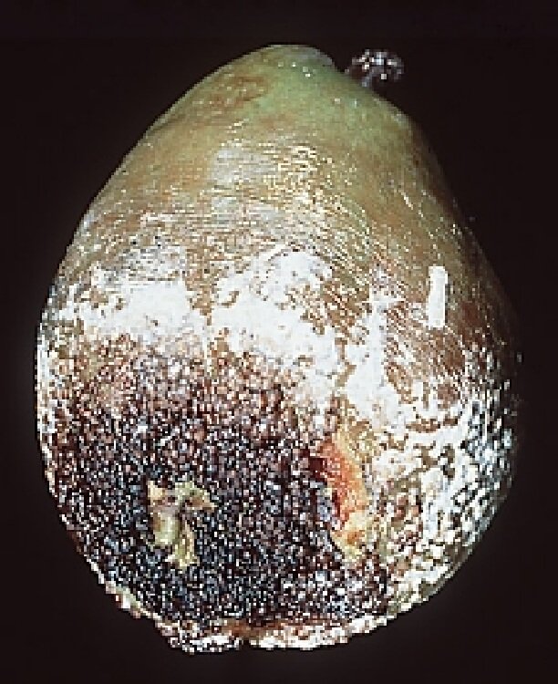 Kursuni ya da gri küf hastaligi nispeten sert çürüklük etmenidir ve meyve sikildiginda mantarimsi, fakat kuruymus gibi bir his vermektedir. Hastalik etmeni genellikle sporlarin rengini alan gri bir spor tabakasi ile karekterize edilir. Depolarda kursuni küften dolayi kayiplar genellikle depolama zamaninin sonlarina dogru meydana gelmektedir ve hastalik genellikle meyvenin kaliksi (çiçek uçu) ya da govde sonunda meydana gelmektedir. Çürüklük saglam dokulara dogru ilerlerken, gri bir spor tabakasi etkilenen yüzey üzerinde gelisebilir. Genellikle depolarda enfeksiyon meyveden meyveye yayilmaktadir ve çürük meyve grublarini meydana getirirler. Kaba ve siyah olan dinlenme sporlari (sklerotlari) meyveler üzerinde olusmaktadir. Yapilan son çalismalarda da hastaligin meyve bahçesinde de görüldügü ve sporlarin meyve bahçesindeyken bulastigini bildirilmektedir.