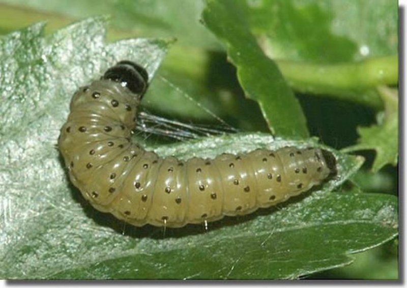 Yaprak yeşil tırtılı ön kanatların dipten mavimsi, siyah ve gümüşi kahverengi; uç kısmı ise beyaz renkli olup, kenarlarında açık kahve renkli lekeler vardır. Larva Baş, göğüs, anal plakalar ve göğüs bacakları parlak siyah renklidir. Sırt kısmında boyuna uzanan koyu yeşil renkli bir şerit, vücut halkaları üzerinde de siyah renkli kabarcıklar vardır.