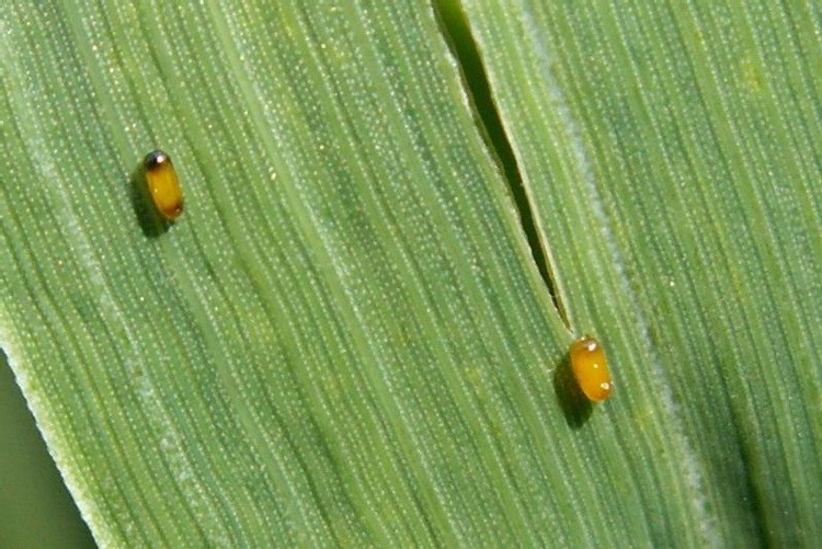 Pupalar önce parlak sarı renkte olup, ergin çıkışına yakın mavimsi-siyah renge dönüşürler. Kışı ergin olarak toprak içinde ve bitki artıkları altında geçirir. Erginler, ilkbaharda toprak sıcaklığı 10 °C'yi geçtiğinde topraktan çıkar, yabani otlara ve tahıllara geçerek beslenir, çiftleşip yumurtalarını bırakırlar. Bir dişi 100-400 adet yumurta bırakır. Yumurtalarını yaprakların üst yüzeyine, damarlara paralel olarak, tek tek veya 2-4 adetlik gruplar halinde zincir gibi bırakırlar. Yumurtalardan 7-10 günde çıkan larvalar yaprakta beslenirler.