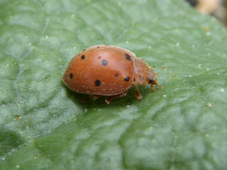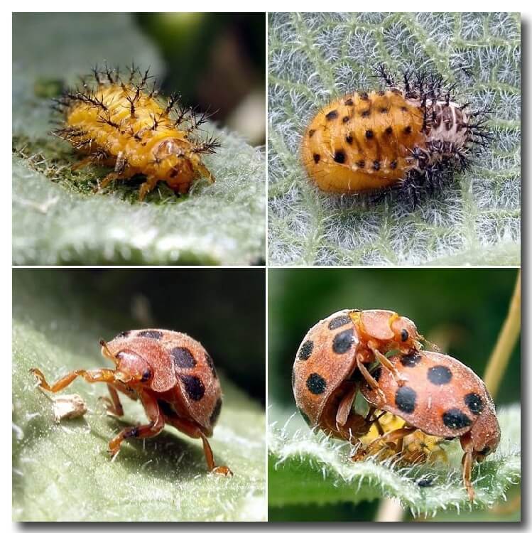 Erginleri 7-9 mm boyunda şekil ve renk olarak Yedi noktalı gelinböceği (Coccinella septempunctata)'ni benzemektedir. Gelin böceğinden daha iri ve bakır kırmızısı rengindedir. Kanatlarının üzerinde toplam 12 adet siyah leke bulunur. Larvaları geniş ve oval olup kavuniçi renkte üzeri, oldukça sert yapıda dikenimsi kıllarla kaplıdır. Yumurta 1.5-2.0 mm boyunda, uzunca ovaldir. İlk bırakıldıklarında parlak sarı olan renk daha sonra portakal sarısına dönüşür.