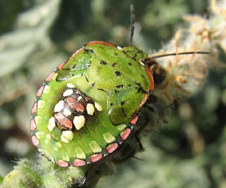 Ergini 13-15 mm boyunda yeşil renktedir. Nimfleri ergine benzer, yeşil ile kahverengi arası renktedir. İlk dönemlerde toplu halde yumurta kümesinin çevresinde bulunurlar, daha sonra dağılırlar. Ergin ve nimfler bitkinin meyve yaprak ve gövdesinde beslenir. Yılda 3 döl verirler.