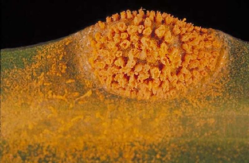 Belirtileri: Yaprakların alt ve üst yüzeyinde 1 mm büyüklüğünde altın sarısı ile pas renginden kahverengiye değişen renklerdeki küçük pas püstülleri görülür. Çok yoğun püstül oluşumu sonucunda yapraklar solar, kurur ve ölür.