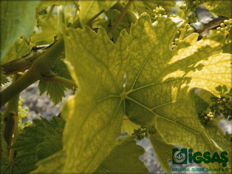 Simptomlar sürgün uçlarına doğru daha şiddetli bir hal alırlar. Büyüme geriler, ana sürgünler çalımsı bir hal alırlar. Salkımlar seyrek ve üzüm taneleri küçük olur. Noksanlık şiddetli ise meyve çok az olur.