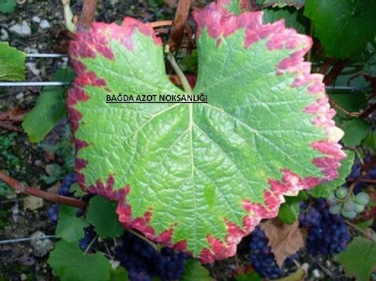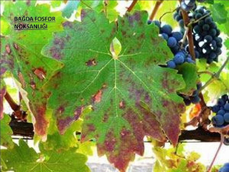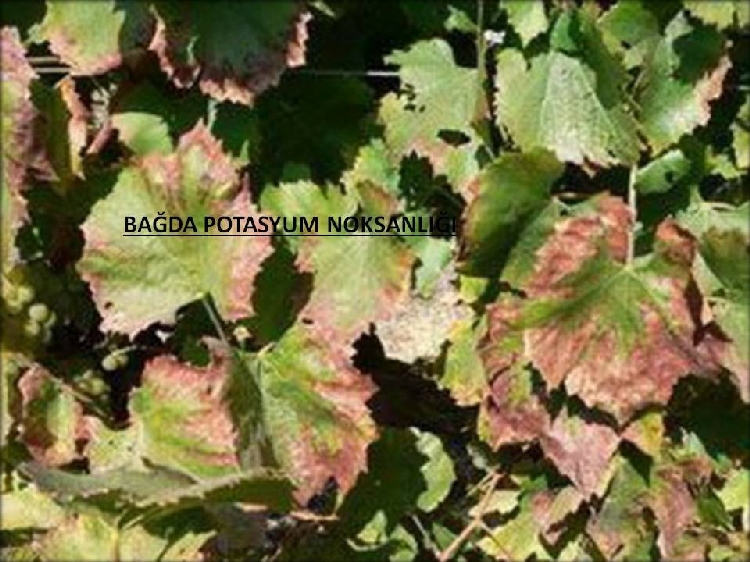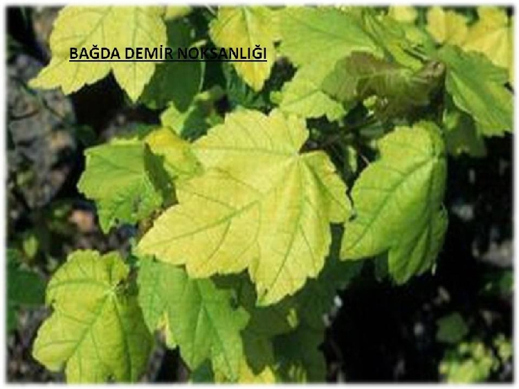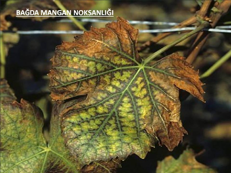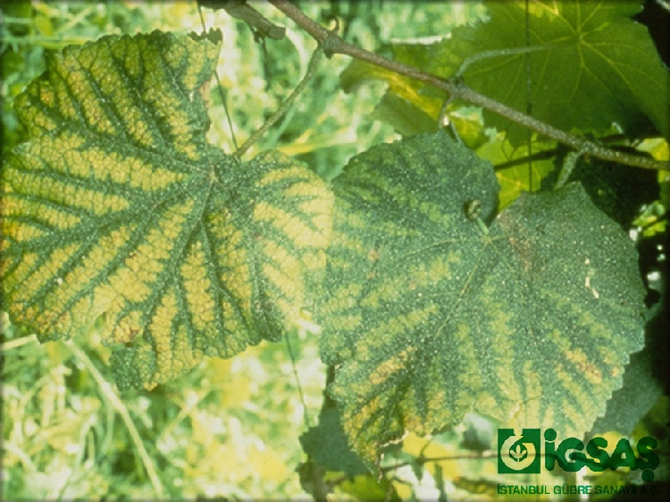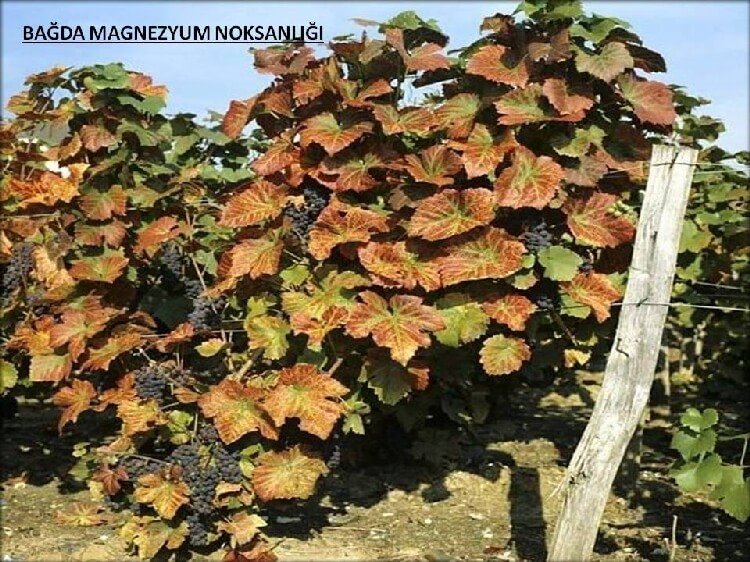 Asma da magnezyum eksikliği yapraklarında damar aralarında lekeler çeklinde başlayarak kloroz, lekelerin hızla genişlemesiyle sapa doğru yayılır ve yaprakta ördek ayağı şeklinde tipik görüntü oluşur. Klorotik bölgelerde kahverengi nekrozlar oluşur.
