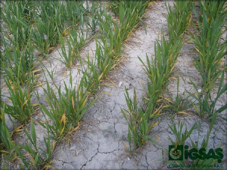 Buğdayda azot noksanlığında, Noksanlık belirtileri alt yapraklarda en şiddetli olarak görülür. Yaprağın uç kısmından başlayarak yaprak kınına doğru yeşil yerine önceleri açık yeşil ve daha sonra sarımsı yeşil renk oluşur.