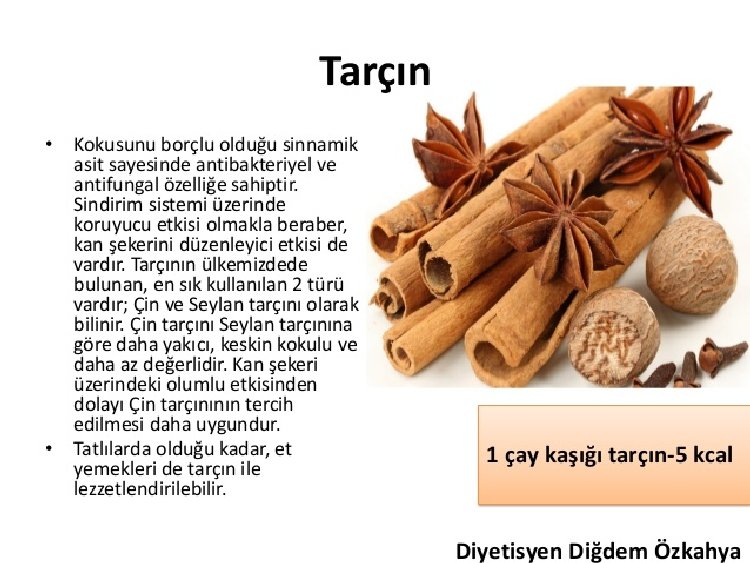 | TARÇIN | Cinnamum Zeylanicum | Hormoları çalıştırıyor mide rahatsızlıklarını gideriyor kusmayı önlüyor. Gaz ve ishale karşı karşı etkili olan tarçın kan şekerini de dengeliyor kırk gün boyunca her gün 5-6 gram tarçın verilen şeker hastalarının kanındaki şeker düzeyinin, kontrol grubuna göre %20 daha düşük olduğu tespit edilmiştir. Tarçın verilen hastaların bazılarında, şeker hastalığının belirtilerinin tammamen yok olduğu da belirtilmiştir. Kan şekerinin yanı sıra kandaki yağ ve kolesterol miktarını da düşürdüğü bilniyor. Tarçın yemeklerde bulunabilen coli bakterisinin vücuda yayılmasını engelliyor. Bal ya da limon suyuyla birlikte alındığında boğazdaki yanmalara adet öncesi gerginliklere iyi geliyor. |