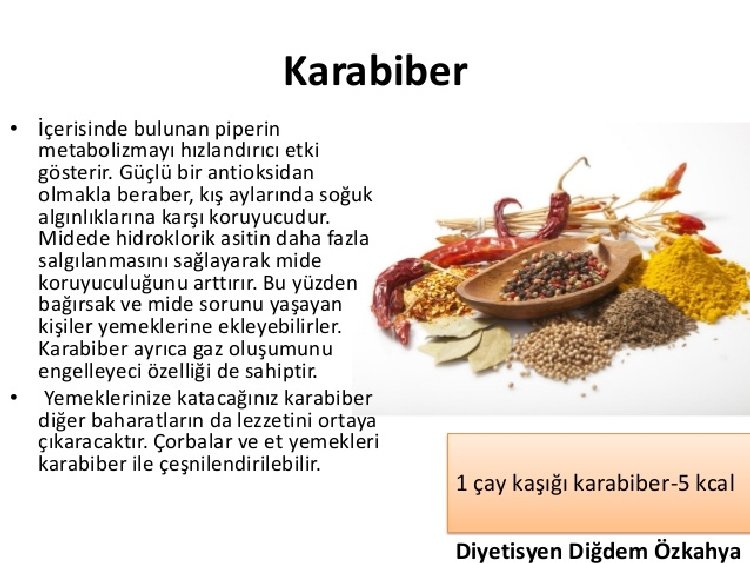 | KARABİBER | Piper nigrum | Kuru ve siyah tanelerinin baharlı ve acı bir tadı vardır. Hemen hemen her türlü yemekte bütün veya toz olarak kullanmak mümkündür. İştah açıcı ve sindirimi kolaylaştırıcı soğuk algınlıklarında ve öksürükte ilaç olarak kullanılıyor |