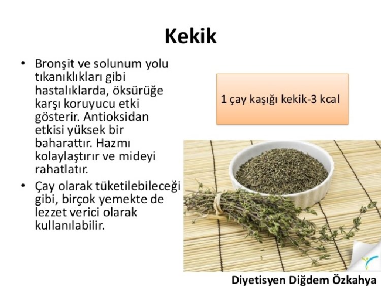 | KEKİK | Herba Thymi | Midevi, yatıştırıcı, antiseptik etkileri vardır. Akne tedavisinde temizleyici ve iyileştirici etkileri görülür. Gırtlak ve bademcik iltihaplarında iyileştirici özelliği vardır. Dezenfekte edici ve balgam söktürücü olarak kullanılır. Öksürük ve üst solunum yolları iltihabında çay ve gargara biçiminde kullanılmalıdır. Akciğer ve bronşlar, mide ve bağırsaklar kekiğin başlıca kullanım alanlarıdır. Boğmaca, öksürük, astım, sinir sistemi zafiyeti, romatizma ve birçok hastalıklara karşı çay içiminin yanı sıra kekik banyoları da çok yararlıdır. Mikrop kırıcı (antiseptik) bir bitkidir. İltihaplı yaraların temizliğinde ve iyileştirilmesinde etkili olur. Doku ve damar büzücü etkileriyle çocuklarda diyare ve yatak ıslatma durumlarının iyileştirilmesinde yardımcı olur. Kekik çayı içimi ve kekikle karıştırılmış bal yenmesiyle organizma güçlendirilebilir ve dengeye kavuşturulabilir. Sabahları kahve veya çay yerine içilen bir bardak kekik çayı, zeka keskinliği, midede rahatlık, sabah öksürüğüne tutulmamak ve genel bir rahatlık hissettirecektir. Alerjik kaşıntılarda, periyot sancılarında, cilt sağlığı ve bakımında, nezle ve soğuk algınlığında, tansiyon ve kan şekeri problemlerinde, böbrek taşı düşürmelerinde, idrar yolu iltihaplarında, diş eti ve ağız problemlerinde en kısa zamanda kesin sonuç vermektedir. Sigara toksinlerinin ve ciğerlerde birikmiş katranın parçalanarak atılmasında etkisi yüksektir. Antibiyotik etkilerinden yararlanmak için sabah, akşam düzenli olarak 5-7 gün içinde tüketilmesi önerilmektedir. |