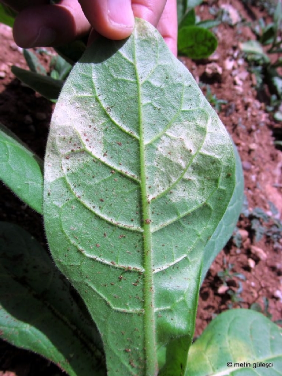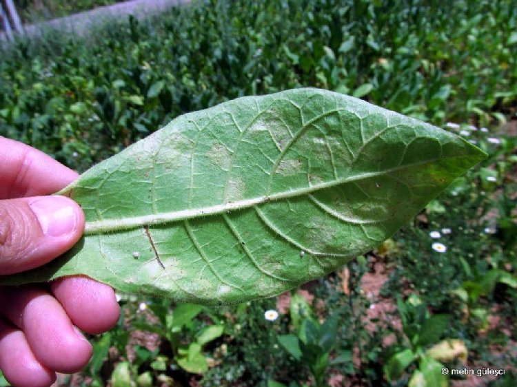 Bu yaprakların uç kısımları hafifçe aşağıya kıvrılır. Üstten sarımsı görülen yaprakların alt yüzlerine bakılacak olursa grimsi veya kirli beyaz-açik eflatun renkli bir küf tabakası ile örtüldüğü görülür. Hava koşulları hastalığın gelişmesine uygun giderse, duyarlı tütün çeşitlerinde söz konusu lekeler kısa zamanda tüm yaprakları sarar. Böyle bitkiler gelişmeyerek kururlar. Patojen, duyarlı tütün çeşitlerinde sistemik enfeksiyonlara da neden olabilir. Böyle durumlarda patojenin yerleştiği doku gelişmez. Yaprağın simetrisi bozulur. Yer yer kıvrılmalar göze çarpar. Bitkiler bodur kalır. Tarla evresindeki belirtiler, fideliklere çok benzer. Yanlız hava koşulları pek uygun olmadığından, daha çok alt yapraklarda görülür.