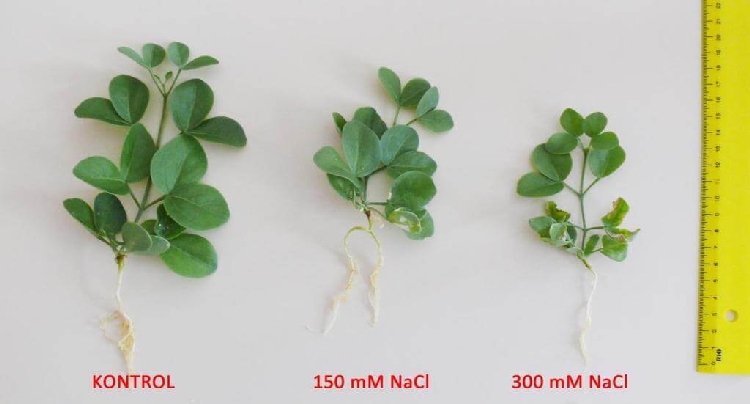Tuz stresi bitkilerde genellikle iki nedenle ortaya çıkar. Kök bölgesinde çözünmüş tuzların fazlalığı sonucunda yoğunluğun artması nedeniyle bitkinin suyu almakta güçlük çekmesi ve bazı iyonların miktarındaki artışa bağlı olarak toksik etkiler göstermesiyle. Aşırı tuz stresi bitkilerde bodurluğa ve kök büyümesinde gerilemeye neden olur. Tomurcuk oluşumu azalır, toprak üstü gelişme olumsuz etkilenir ve yapraklar küçük kalır. Hücrelerin ölmeleri sonucu köklerde, tomurcuklarda, yaprak kenarlarında ve büyüme uçlarında sarı lekeler (Nekroz) oluşur.
