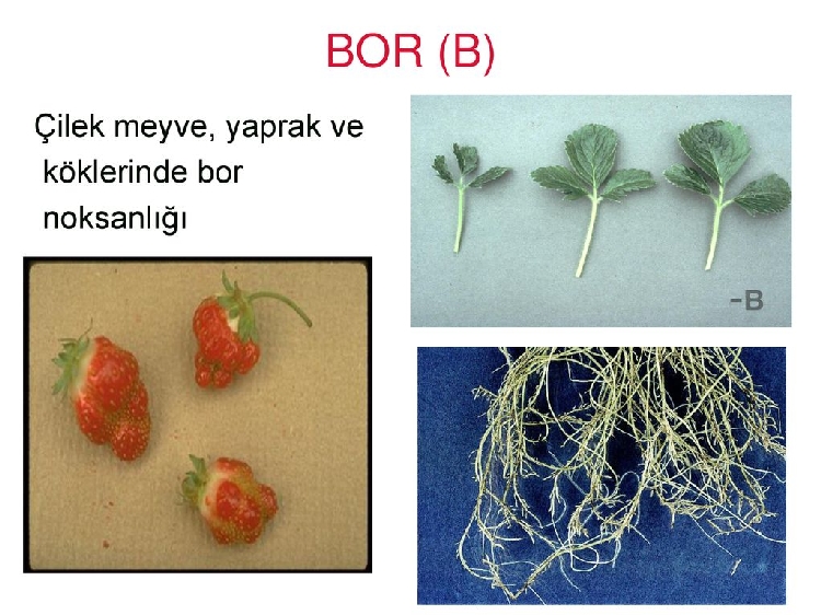 - Bor eksikliğinin yapraktaki belirtileri herbisit zararı, kalsiyum eksiliği, soğuk zararı belirtilerine benzediği için karıştırılmamalı.