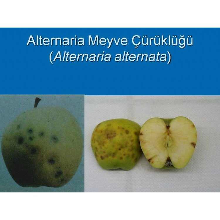 Alternarya Meyve Çürüklüğü hasat öncesi ve sonrası meyve çürümelerine neden olurlar. Elmanın çiçek çukuru etrafında veya orta kısımlarında önceleri renk açılmasına neden olur. Bu lezyonlar kuru olup, kahverenginden siyah renge dönüşür. Elmadaki belirtisi meyve etinden çekirdek evine doğru (40–50 mm.) derinlemesine ilerleyen ve kısmen de yüzeysel olarak çürüyen bölgeler, siyah veya kahverengimsi renkte, yassı ve kenarları belirgin çökük lekeler şeklinde görülür