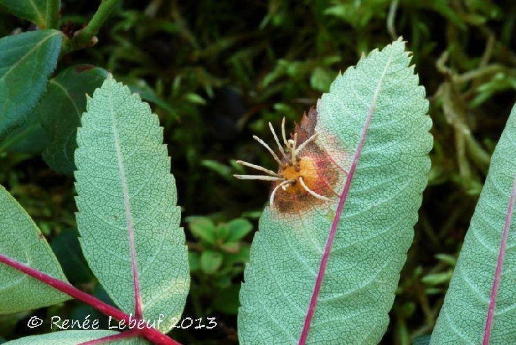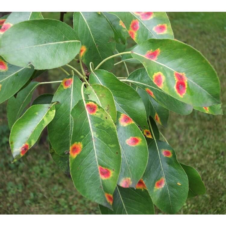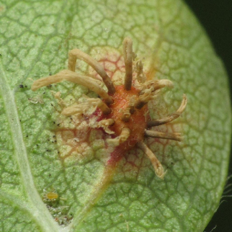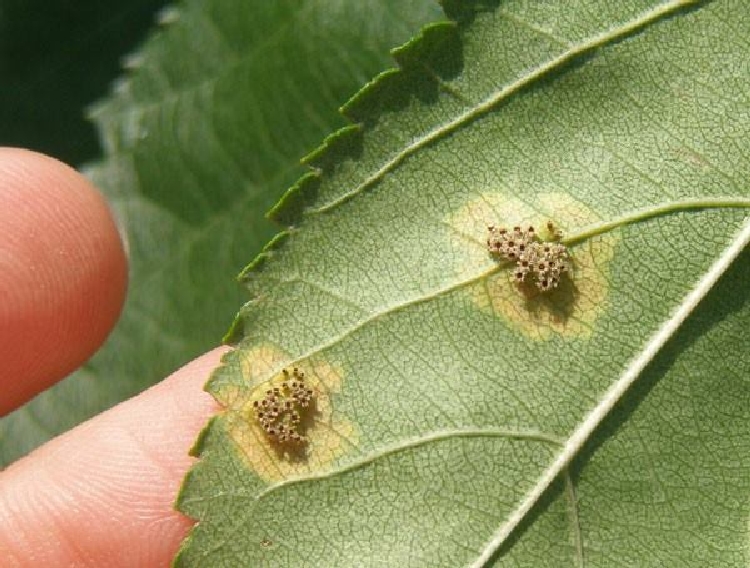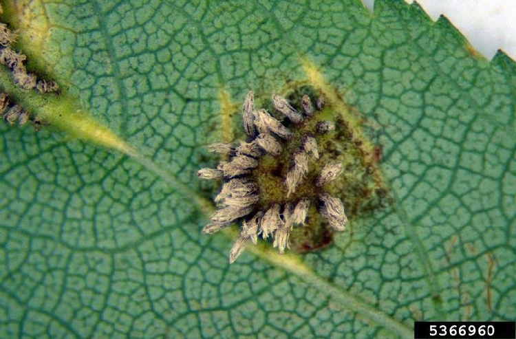 Yaprak ve meyvelerdeki lekeler portakal kırmızı renginde, yuvarlak veya uzuncadır. Bu lekeler üzerinde siyah noktacıklar bulunur. Yaprağın alt yüzeyinde ise meme şeklinde çıkıntılar görülür. Bazen yaprakların yarısından çoğu dökülür. Hastalıklı meyveler ise küçük ve şekilsiz olur.