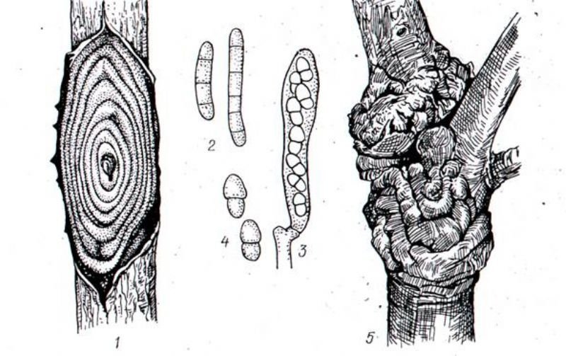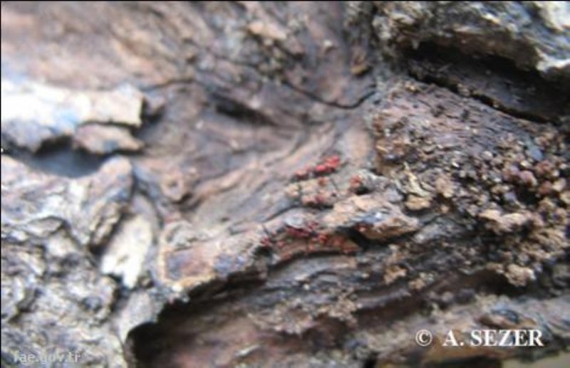 Bu yaralar bazen 20 cm'ye kadar ulaşabilmektedir. Yaralar genellikle dalın bir tarafında olmakta, bu dallar bir süre canlılıklarını sürdürebilmektedirler. Hastalık etmeninin yaşlı kanserlerin kenarlarında, ölü kabukların altında, çatlaklar içinde bazen dağınık bazen de kümeler halinde olan küçük, parlak, kırmızı renkteki periteslerinden boşalan askosporları ile yeni enfeksiyonlar başlar.