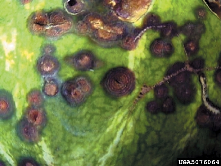 Hastalığın meyvelerdeki belirtileri ise 1–2 mm çapından daha büyük daire veya düzensiz çöküntü halinde lekelerdir. Rutubetli havalarda bu lezyonlar üzerinde kavuniçi bir renk oluşur, hastalığın tanınması bakımından tipik bir görünümdür. Bu fungus yağışlı geçen yıllarda ürün kaybına neden olabilir.