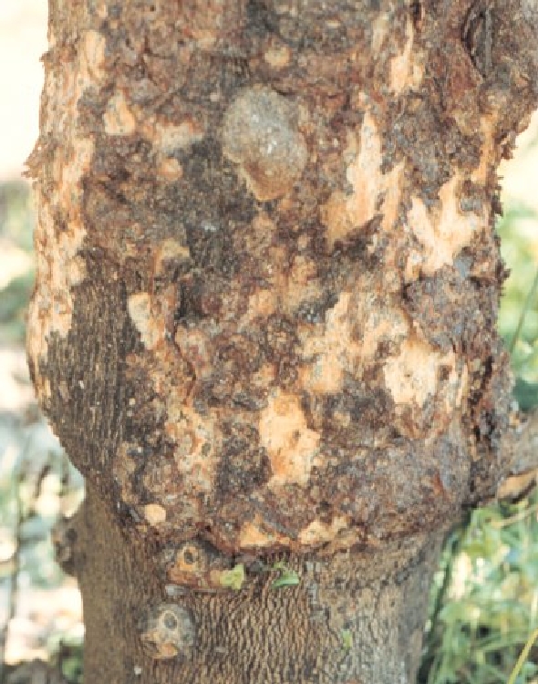 Erken ilkbaharda bitkilerin genç yapraklarında soluk bantlar oluşur. Bu bantlar olgun yapraklarda kaybolur. Ağaçların gövde ve kalın dal kabuklarında pul şeklinde kavlamalar ve dökülmeler görülür. Dökülen kabukların yerlerinde sarımsı lekeler oluşur. Kabukların kavladığı yerlerden zamk akıntısı olur. Ağaçların uç bölgelerinde yapraklarda sararmalar ve dallarda kurumalar görülür.