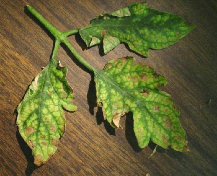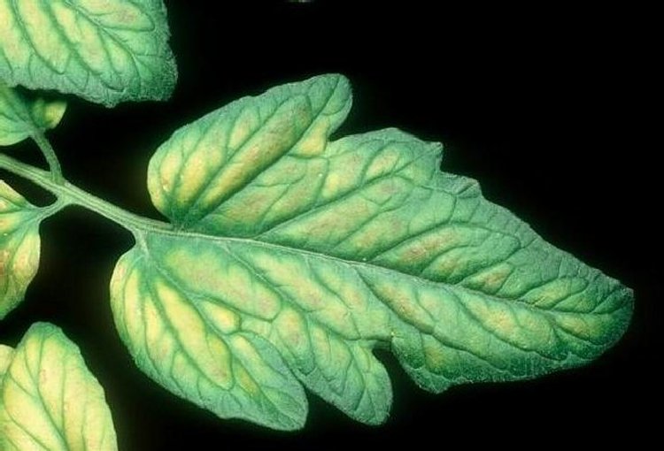 Domateste magnezyum noksanlığında, yaşlı yapraklarda damar aralarında, kenarlardan başlayıp içe doğru ilerleyen sararma şeklinde kloroz görülür. Sonunda bütün yaprak sarıya döner. Kahverengi keler oluşur. Yapraklar gövdeye doğru sarkar ve ölür.