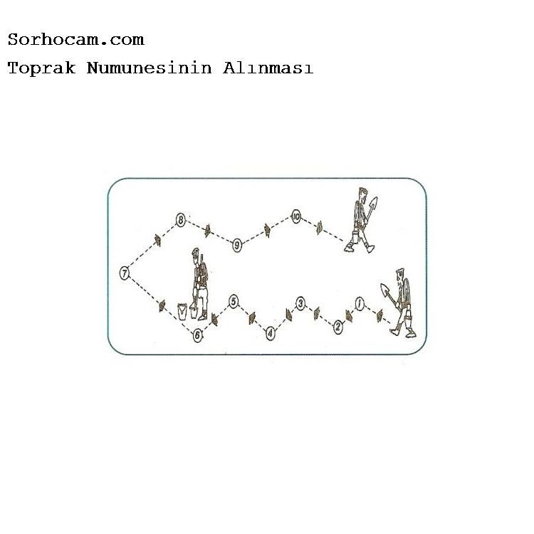 4.Toprak numunesi alınacak bir örnek arazide, zig-zaglı yürünerek araziyi temsil edecek noktalar işaretlenir ve numune alınır. 20 dekarlık bir arazide örnek alınacak yer sayısı asgari 6 olmalıdır.
