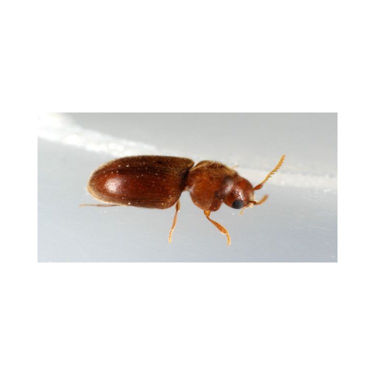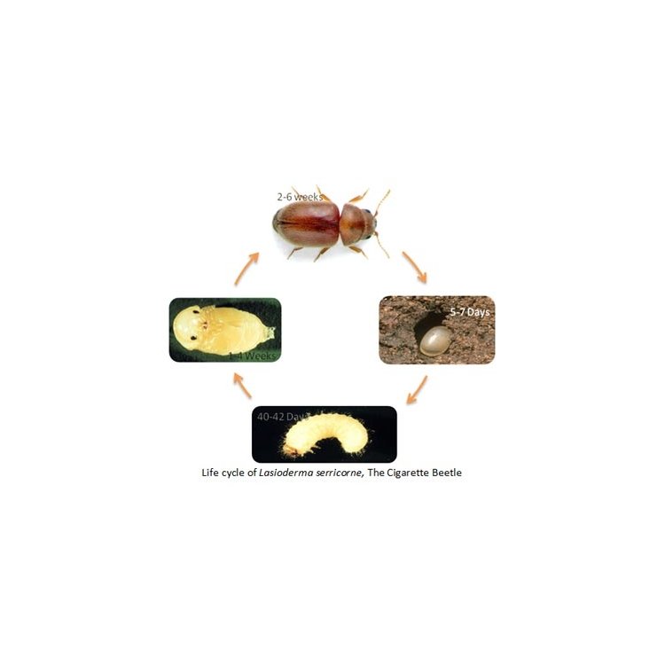 Erginlerin rengi kırmızımsı sarı ile koyu kırmızıya kadar değişir ve 2-3.5 mm boydadır. Larva kıvrık şekilli, sarımsı beyaz renklidir. Zararlı kışı tütün depolarında denkler içinde veya döşemeler arasında bir kapsül içinde larva olarak geçirir. Havaların ısınmasıyla birlikte beslenmesine devam eder.