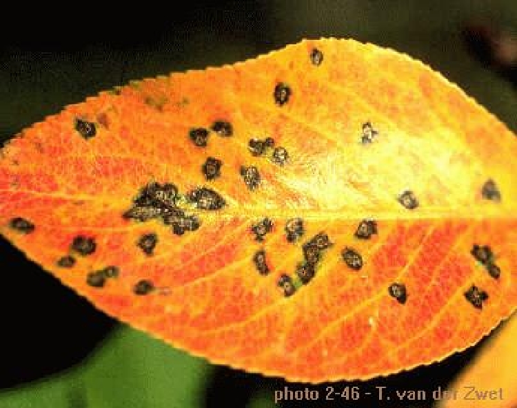 Hastaligin baslangiç belirtileri küçük, 14 mm çapinda açili kirmizi kahverengi renkli lekeler seklindedir. Lekeler çogunlukla üst yaprak üzerinde meydana gelir. Lekeler genislerken, birlesir ve yapraklar yanik bir sekil almaktadir. Dal ve gövdelerde ise çökük lekeler olusur. Kanser olarak adlandirilan bu lezyonlar uzunlamasina olarak gövde de ya da dalda gözükür ve bazen gövdeyi sararak dal ve bitkinin geriye dogru ölümününe sebebiyet verir. Bir el büyüteçi ile yapraklardaki lekelere bakildiginda bir çok siyah benekler yaprak lezyonlari üzerinde görülür. Bu lekeler fungusun üreme organlaridir.