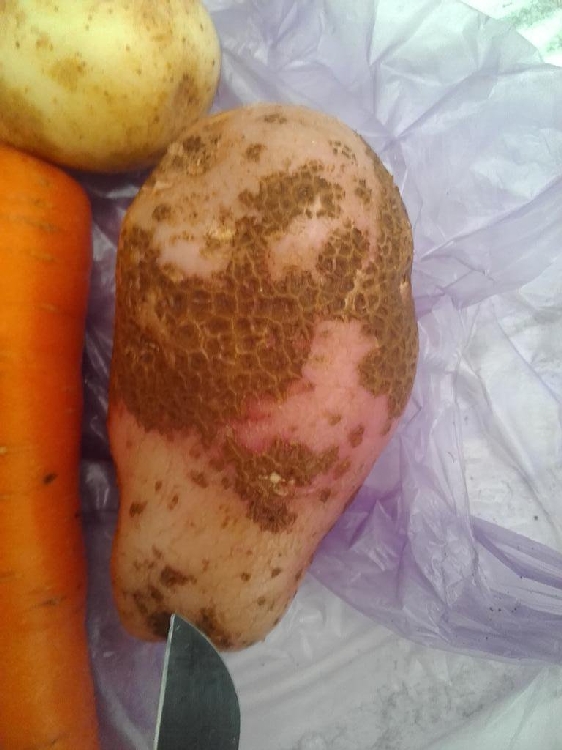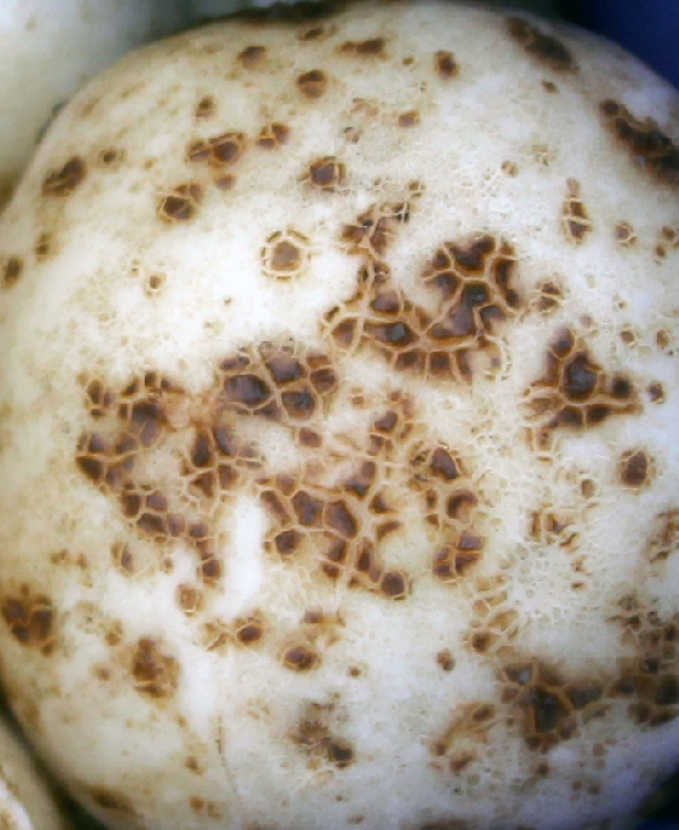 Hastalık yumrularda ilk belirti olarak küçük yuvarlak lekeler halinde ortaya çıkar. Bu lekecikler yumruyla birlikte büyüyerek renkleri koyulaşır. Bu lekelerin olduğu yerdeki kabuğu ince bir şekilde kesersek, altta saman sarısı bir renk oluştuğu görülür.
